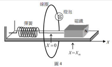 連。在彈簧為自然長度時,磁鐵的中心位於坐標$X=0$處,且此處的鉛垂截面上放著一個固定的圓形導體線圈。磁鐵進出線圈時,因電磁感應而出現的電流,會使線圈上的燈泡產生亮暗之變化。如果彈簧從伸長$X_m$的位置,由靜止狀態釋放,開始來回振動,則下列敘述哪些正確?(應選2項)(A)磁鐵接近線圈時,線圈對磁鐵會產生吸引力