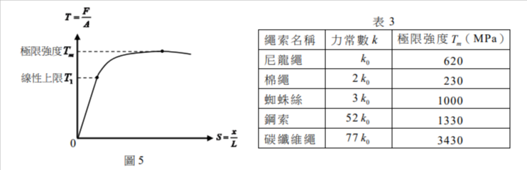 <題組題>[題組:第41題到第43題]一些常見的繩索在拉力作用的情況下,與彈簧類似。當達成靜力平衡時,其伸長量$x$會隨著拉力的量值F而改變。若以$L$與$A$分別代表繩索未受拉力時的長度與橫截面積,並令繩索單位長度的伸長量$x/L=S$,單位面積所受的拉力$F/A=T$,則$T$對$S$的曲線大致如圖5所示。當T不超過線性上限$T_1$時,因$L$與$A$為定值,故拉力$F$與伸長量$x$成正比,即$F=kx$,式中$k$為力常數。當繩索受到拉力而未斷裂時,$T$的最大值稱為極限強度,以$T_m$表示。