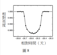 方通過的現象稱為「凌日」。在宇宙中的其他恆星周圍也可能存在行星,當行星繞其恆星公轉時,從地球看過去,如果行星恰巧從其恆星之前方通過,即發生類似凌日的現象,其恆星的亮度會減弱一點點,直到行星完全通過恆星盤面,才又恢復為原亮度。圖8是克卜勒太空望遠鏡觀測編號Kepler-8這顆恆星之亮度隨時間變化的情形。恆星沒有被行星「凌」時的相對亮度定義為1.000,發生「凌」時恆星亮度變暗,於數小時之後恢復,這樣的變化周而復始,週期約為3.5天。Kepler-8的光譜型為F,視星等為14星等,而造成「凌」現象的行星稱為Kepler-8b,據估計其半徑為木星的1.4倍,質量則為木星的60%。行星Kepler-8b的平均密度大約為木星的幾倍?