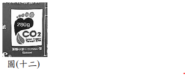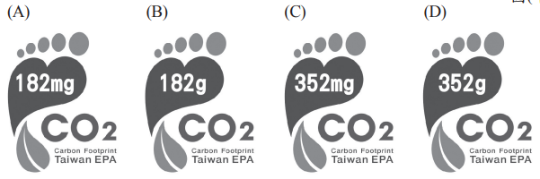 <單選題>圖(十二)為可樂包裝上的碳足跡標籤,標籤上的數字代表此可樂(包Image含瓶子)從製造、運輸、使用到回收等過程中,各階段所產生的溫室氣體,經換算後相當於總共排放出280g的二氧化碳。若某運動飲料的碳足跡經換算後為8莫耳的二氧化碳,則此運動飲料的碳足跡標示應為下列何者?(碳和氧的原子量分別為12與16)Image