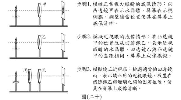 快查考古題 > 105會考自然試題_43 Posted in 會考105自然 會考自然105會考自然試題_43 🤖 🔊 朗讀內容 正在生成語音... <單選題>智新設計實驗來模擬近視眼及其矯正後的情形,其步驟如圖(二十)所示:(此實驗設計有一個錯誤)。關於修正此錯誤的方式,下列何者最適當? (A)將實驗中的凹透鏡乙改為焦距較甲短的凸透鏡 (B)將實驗中的凹透鏡乙改為焦距較甲長的凸透鏡 (C)將實驗中的凹透鏡丙改為適當焦距的凸透鏡 (D)將步驟3中的凹透鏡丙改放置在凹透鏡乙與屏幕之間 答案 (A) 近視眼水晶體焦距過短,模擬時應用焦距較甲短的凸透鏡代替凹透鏡乙,選(A) 題目與答案 借題發想 加入最愛清單 加最愛