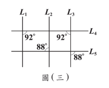 $L_1$、$L_3$同側內角$92^\circ+92^\circ\neq180^\circ$故不平行;$L_2$、$L_3$同位角均為$88^\circ$故平行。