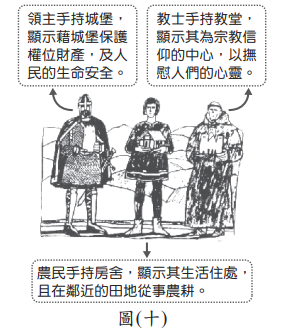 快查考古題 > 106會考社會試題_25 Posted in 會考106社會 會考社會106會考社會試題_25 🤖 🔊 朗讀內容 正在生成語音... <單選題>圖(十)為歐洲史上某時期社會的主要階層及其職責,此圖最可能是呈現下列何者的情況? 階層與職責:領主(持城堡,保護財產與人民)、教士(持教堂,撫慰人心)、農民(持房舍,從事農耕) (A)古希臘時代 (B)羅馬共和時期 (C)中世紀的西歐 (D)工業革命後的英國 答案 (C) 圖中領主、教士、農民的階層結構,及城堡防禦、莊園農耕的特徵,對應中世紀西歐的封建制度與莊園經濟。 題目與答案 借題發想 加入最愛清單 加最愛