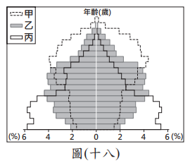 <單選題>某國受到人口結構改變的衝擊,長期照護、專屬旅遊、到府清潔、就醫接送等「陪伴商機」也應運而生。圖(十八)為該國不同時期的人口金字塔,該國出現上述陪伴商機最可能是因為其人口結構如何轉變?