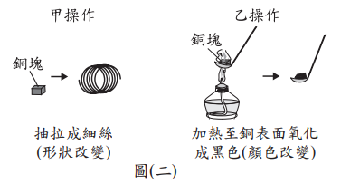 <單選題>圖(二)為對兩塊銅塊分別進行甲和乙兩種操作的示意圖,關於這兩種操作造成外觀上的改變是否為化學變化,下列判斷何者正確?Image