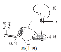 快查考古題 > 106會考自然試題_24 Posted in 會考106自然 會考自然106會考自然試題_24 🤖 🔊 朗讀內容 正在生成語音... <單選題>一般人手指觸電後會立刻縮手,也會感覺疼痛而趕緊甩手。圖(十四)為人體指尖觸電時神經訊息傳導的示意圖,圖中甲、乙、丙分別為訊息傳導所經過的神經,下列有關此訊息傳導路徑相關敘述與所對應的神經之配對,何者最合理? (A)觸電後立刻縮手—甲、乙 (B)觸電後感覺疼痛—乙、丙 (C)受器接受刺激後傳至中樞神經—乙、丙 (D)中樞神經發出甩手的命令後傳至動器—丙、甲 答案 (A) 立刻縮手是反射動作,傳導路徑為觸電部位→甲(感覺神經)→脊髓→乙(運動神經)→肌肉,選(A) 題目與答案 借題發想 加入最愛清單 加最愛 相關試題105會考自然試題_49 會考自然 106會考自然試題_54 會考自然 107會考自然試題_03 會考自然 106會考自然試題_02 會考自然 105會考自然試題_38 會考自然 105會考自然試題_32 會考自然