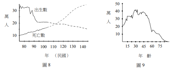 哇來找 > 106學測自然試題-45 Posted in 106學測自然 自然106學測自然試題-45 <多選題>假設圖8為臺灣地區人口之實測(實線)及預測(虛線)圖,圖9為該地區在103年之不同年齡的人口數量分布圖。又設民國110年之人口約為2000萬人,且死亡率在人口最多的年齡後遞增。依圖8及圖9所示,下列敘述哪些正確?(應選3項) (A)民國105年臺灣地區人口仍在成長 (B)民國110年時的出生率約為20% (C)民國115年時圖9曲線的高峰向右移 (D)民國125年後人口減少速率加快 (E)臺灣地區人口的成長曲線為典型之2型 答案 (A)正確,105年出生數大於死亡數。(C)正確,隨時間年齡結構右移。(D)正確,預測顯示人口下降加速。(B)錯誤,20%出生率過高。(E)錯誤,臺灣為低生育率國家。故選 (A)(C)(D)。 報錯 ChatGPT DeepSeek 試題內容 試題內容 選擇題答案 加入最愛清單 加最愛 相關試題106學測自然試題-64 自然 106學測自然試題-63 自然 106學測自然試題-65 自然 106學測自然試題-53 自然 106學測自然試題-42 自然 106學測自然試題-49 自然