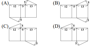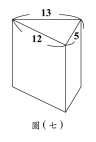 <單選題>圖(七)為一直角柱,其底面是三邊長為 5、12、13的直角三角形。若下列選項中的圖形均由三個Image矩形與兩個直角三角形組合而成,且其中一個為圖(七)的直角柱的展開圖,則根據圖形中標示的邊長與直角記號判斷,此展開圖為何?