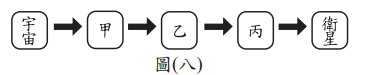 <單選題>圖(八)是學生整理的宇宙組織關係圖,甲、乙、丙代表三個不同層級的結構,且三者在空間中的大小關係為$甲\gt乙\gt丙$。下列有關三者的敘述,何者最合理?Image