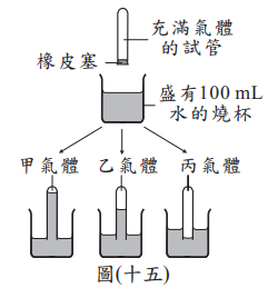 入盛有100 mL 水的相同燒杯中,拔開橡皮塞,經一段時間後觀察試管的情況,如圖(十五)所示。若不考慮水的蒸發,則表(二)內四人對於甲、乙、丙三種氣體在水中溶解度的比較,與收集氣體方法的判斷,何者正確?
