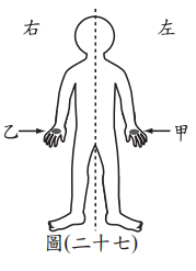 <單選題>圖(二十七)為人體注射藥劑的部位示意圖,關於藥劑從甲部位或乙部位注入人體的靜脈後,經由血液循環最先進入心臟腔室的敘述,下列何者最合理?Image