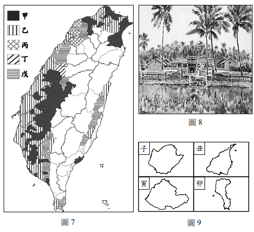 ◎ 明清之際,移民臺灣的漢人多來自漳州、泉州、嘉應州、潮州和惠州等地區。圖 7 是根據 1926 年《臺灣在籍漢民族鄉貫別調查》的資料,以街、店為單位繪製的「祖籍優佔區」分布圖。祖籍優佔區係指某一祖籍人口佔該地總人口比例最高的地區。圖 8 是某畫家的水彩畫作,主題為椰林圍繞的客家宗祠,圖 9 是臺灣四個縣市的輪廓圖。請問: