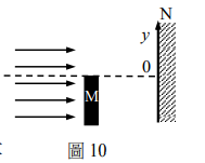 <多選題>如圖 10 所示,光沿水平方向行進,經過一片不透光之擋板 M 後,照射在垂直牆面 N 上,虛線