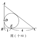 <單選題>圖(十四)直角三角形\(ABC\)的內切圓與\(\overline{AB}\)、\(\overline{BC}\)相切於\(D\)、\(E\),\(\overline{BE}=1\)、\(\overline{CE}=4\),\(\overline{AD}\)長為何?Image