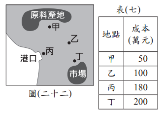 <單選題>王先生計畫在圖(二十二)中的甲、乙、丙、丁選擇一地開設工廠,表(七)呈現選擇不同地點設廠的生產成本。若不同設廠地點的成本差異僅來自運輸成本,則相較於原料,該工廠的產品具有下列何種特性?Image(A)易腐敗