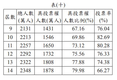 總人口與具投票權人數上升,但不具投票權人數(主要為兒童)逐年下降,反映少子化導致未成年人口減少;政治參與意願時升時降,無法判斷自然與社會增加率,也無政黨制相關數據。