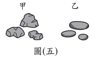 的石頭,並依採集地點分成甲、乙兩組。已知這兩組石頭的組成成分皆相同,但甲組表面具有明顯稜角,乙組表面則光滑平坦且大致呈橢圓形,如圖(五)所示。關於甲、乙兩組石頭的採集地點與造成兩組石頭外觀差異的推論,下列何者最合理?