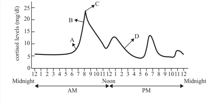 皮質醇高峰在8-9a.m.、12-1p.m.、5:30-6:30p.m.,2:30p.m.在高峰後,適合喝咖啡,選D。