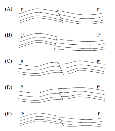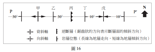 哇來找 > 108學測自然試題-45 Posted in 108學測自然 自然108學測自然試題-45 <單選題>45-46為題組 地質學家沿著地面PP’路線進行地質調查,記錄了野外地質資料如圖16所示,其中「地層走向」為地層面與水平面的交線,「地層傾角」為地層傾斜方向,及其層面與水平面的最大交角: 根據野外地質資料所描繪出的地質剖面圖,下列何者正確? 答案 圖16顯示背斜、向斜、逆斷層。背斜軸在左,向斜軸在右,中間有逆斷層(鋸齒在傾斜方向)。地層傾角資料:左側地層向左傾,右側地層向右傾。剖面應為背斜(左)、逆斷層(中)、向斜(右)。對應選項(B)。 報錯 ChatGPT DeepSeek 試題內容 試題內容 選擇題答案 加入最愛清單 加最愛 相關試題108學測自然試題-64 自然 114分科生物考科-06 自然 114學測自然考科18 自然 114分科生物考科-05 自然 114分科生物考科-04 自然 114學測自然考科26 自然