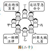 快查考古題 > 109會考社會試題_39 Posted in 會考109社會 會考社會109會考社會試題_39 🤖 🔊 朗讀內容 正在生成語音... <單選題>阿鴻參加大學同學會,同桌有四位任職於我國中央政府機關的同學,分別談論了自己的工作職權,聊天內容與座位如圖(二十)所示。若阿鴻兩旁的同學分別任職於行政院與司法院,根據圖中內容判斷,他的座位最可能位於圖中何處? (A)甲 (B)乙 (C)丙 (D)丁 答案 (A) 行政院職權包括提出總預算,司法院職權包括統一解釋法律。甲座位兩旁分別對應此兩項職權,故阿鴻座位最可能為甲。 題目與答案 借題發想 加入最愛清單 加最愛 相關試題107會考社會試題_41 會考社會 110會考社會試題_42 會考社會 106會考社會試題_26 會考社會 106會考社會試題_28 會考社會 109會考社會試題_11 會考社會 109會考社會試題_45 會考社會