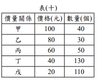 需求法則為價高量少、價低量多。甲、丁的價量關係違反需求法則,乙、丙、戊的價量變化符合該法則。