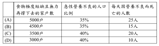 某一總家戶數 2萬、總人口數 10萬的地區發生糧食短缺,根據「糧食安全階段綜合分類」的標準,該區在下列何種狀態時達到「饑荒」的標準?