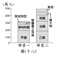快查考古題 > 110會考社會試題_40 Posted in 會考110社會 會考社會110會考社會試題_40 🤖 🔊 朗讀內容 正在生成語音... <單選題>圖(十八)是某戰爭中,交戰雙方(陣營一、陣營二)各成員國的軍隊陣亡人數圖。圖中的甲與乙最可能分別是哪兩國? (A)甲:美國,乙:德國 (B)甲:德國,乙:俄國 (C)甲:日本,乙:中國 (D)甲:俄國,乙:美國 答案 (B) 圖中陣營對應第一次世界大戰的同盟國與協約國。德國屬同盟國,俄國屬協約國,兩國均為主要交戰國,陣亡人數眾多,與甲、乙的數據特徵相符。 題目與答案 借題發想 加入最愛清單 加最愛