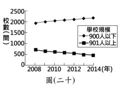 <單選題>圖(二十)顯示2008至2014年臺灣不同規模的國小校數變化,此種變化趨勢與下列哪一臺灣社會現象的關係最密切?