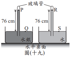 <單選題>一大氣壓下,兩裝置如圖(十九)所示,P、R在玻璃管內液面,Q、S在玻璃管外容器內液面。哪兩個點的氣壓為一大氣壓?Image