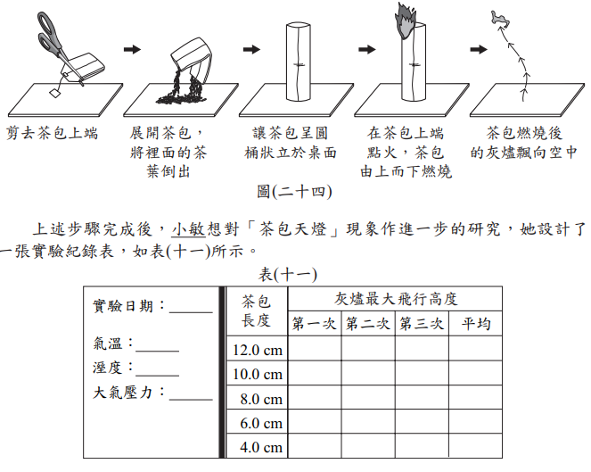 小敏複製網路上「茶包天燈」這個科學實驗,其流程如圖(二十四)所示。她 在無風的環境進行實驗,當實驗進行到最後,茶包燃燒後的灰燼會飄向空中, 如同一個小天燈。小敏認為此現象的成因應該與熱對流有關,茶包上方的空氣 受到加熱而上升時,周圍的冷空氣遞補而形成熱對流,茶包灰燼因重量很輕而 受到空氣的帶動飄向空中。Image