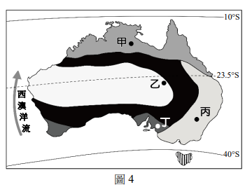 圖 4 為某國的氣候分區圖。請問:圖 4 中哪個地點最可能位於原為古海盆的低地區,早期多利用自噴井取水,發展畜牧業,近年來逐漸鑿取深層地下水,卻因鹽分過高,已危及當地的畜牧業發展?
