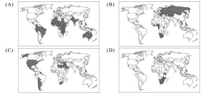 下列為四種主題的分布圖。其中哪張分布圖的國家群,因成年人罹患上文中該疾病的比例偏高,且致死率亦高,或許也可考慮採用強制授權的做法,來降低病患負擔?