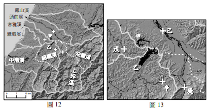 2021年春季臺灣水情吃緊,各縣市水庫蓄水量成為社會關注焦點。水庫有多種形式,若根據水庫與河流的位置關係,可分為「在槽水庫」與「離槽水庫」,前者是指水庫位於主流河道上;後者指水庫的主要水源自鄰近河道上興建水壩或攜河堰經重力輸水而來。例如,曾文水庫位在曾文溪主流,而烏山頭水庫則是透過隧道自曾文溪越坡引水。圖12顯示新竹苗栗地區的河流流域範圍(白色實線與虛線分別代表主流域與次流域)、主要河道與水庫(深黑色)的分佈;頭前溪有上坪溪與油羅溪兩大源流,峨眉溪則為中港溪的支流;甲、乙兩水庫是離槽水庫。圖13為圖12的局部放大,圖中的十字標「+」在二幅圖內的相對位置皆相同。請問:
