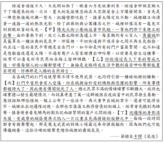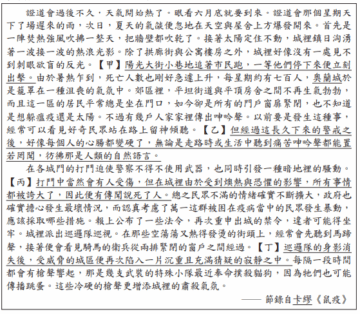 快查考古題 > 111會考國文試題_30 Posted in 會考111國文. 會考國文111會考國文試題_30 🤖 🔊 朗讀內容 正在生成語音... <題組題>[題組:第30-31題]請閱讀以下短文,並回答30~31題: 根據本文,關於巡邏隊的敘述,下列何者最恰當? (A)巡邏隊的設立有效防止了疫情的擴散 (B)巡邏隊的存在加劇了居民的恐懼猜疑 (C)巡邏隊的主要任務是維持城內秩序 (D)巡邏隊由專業醫療人員組成 答案 B 文中描述巡邏隊的存在「反而加劇了居民的恐懼猜疑」 題目與答案 借題發想 加入最愛清單 加最愛 相關試題112會考國文考題_30 會考國文 112會考國文考題_41 會考國文 113會考國文考題_28 會考國文 110會考國文試題_44 會考國文 111會考國文試題_34 會考國文 111會考國文試題_41 會考國文