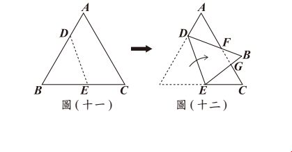 快查考古題 > 111會考數學考題_20 Posted in 會考111數學 會考數學111會考數學考題_20 🤖 🔊 朗讀內容 正在生成語音... <選擇題>圖(十一)為一張正三角形紙片 $ABC$,其中 $D$ 點在 $AB$ 上,$E$ 點在 $BC$ 上。今以 $DE$ 為摺線將 $B$ 點往右摺後,$BD$、$BE$ 分別與 $AC$ 相交於 $F$ 點、$G$ 點,如圖(十二)所示。若 $AD= 10$,$AF= 16$,$DF= 14$,$BF= 8$,則 $CG$ 的長度為多少? (A) $7$ (B) $8$ (C) $9$ (D) $10$ 答案 C 摺疊後 $BD=FD=14$,$AB=AD+DB=24$。利用相似三角形或梅涅勞斯定理,可得 $CG=9$。 題目與答案 借題發想 加入最愛清單 加最愛 相關試題112會考數學考題_20 會考數學 112會考數學考題_22 會考數學 114會考數學考題_22 會考數學 111會考數學考題_17 會考數學 113會考數學考題_23 會考數學 107會考數學試題_20 會考107數學