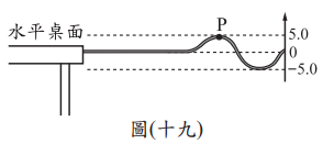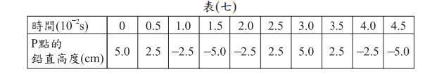 <單選題>一輕繩一端固定於桌緣,水平拉直後以固定頻率鉛直上下振動產生繩波,繩波上一點P的鉛直高度與時間的關係如表(七)所示。依據此表推論此繩波的週期最可能為何者?Image