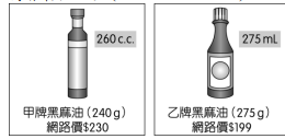 <單選題>附圖為阿榮在購物網站上搜尋黑麻油所獲得的部分結果,圖中的數值為黑麻油的內容物含量及價格,他比較甲、乙兩種品牌的含量,覺得數值有不合理之處。下列關於甲、乙兩牌標示的敘述,何者最合理?(註:1 c.c. = 1 \(cm^3\))