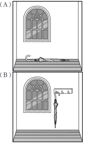 描述為雨傘躺在窗戶下方,對應圖片A。