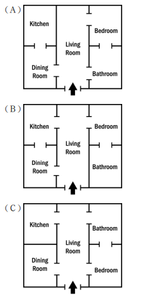 <英聽>M: (sound of opening the door) Please come in. Let me show you the apartment. This is the living room. The kitchen and the dining room are on your left. The bedroom and the bathroom are on the other side. The bathroom is by the front door, and you get to it from both the bedroom and the living room. This way, visitors can use the bathroom without walking through your bedroom. Right across the bathroom is the dining room, and you can see in here the only door to the kitchen. This way, any smoke in the kitchen won’t get into the living room. How do you like your apartment?