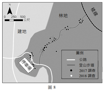 ◎ 臺灣某處緊鄰聚落的淺山(22.63°N,120.31°E)海拔約300m,有許多臺灣獼猴棲息於此,當遊客沿登山步道健行時,常發生猴子搶奪遊客食物的問題。圖8是某校老師在2017年與2018年,帶領學生進行調查後繪製的獼猴族群分布圖。師生們發現,這兩年該區沒有劇烈的地形、氣候等自然條件變動,但猴群卻出現移動的趨勢。請問: