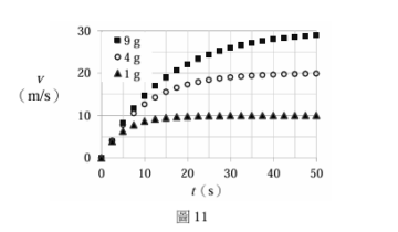 在落體實驗中將半徑相同、質量為 1 g、4 g、9 g 的三個球,從離地同一高度處由靜止落下,測得各球下落的速率 v 在 t > 50 s 後均趨於穩定,其比值為 1 : 2 : 3,如圖 11 所示。若空氣施予各球的阻力與浮力的合力,其量值 F 與下落速率 v 的關係可近似為 F = αv^β ,其中常數 α 和 β 均與球的質量無關,則依據圖示資料,β 最接近下列何者?