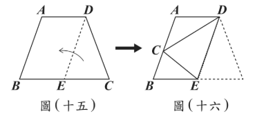 <選擇題>如圖(十五),等腰梯形紙片\(ABCD\)中,\(AD // BC\)、\(AB = DC\)、\(\angle B = \angle C\),且\(E\)點在\(BC\)上,\(DE // AB\)。今以\(DE\)為摺線將\(C\)點向左摺後,\(C\)點恰落在\(AB\)上,如圖(十六)所示。若\(CE = 2\)、\(DE = 4\),則圖(十六)的\(BC\)與\(AC\)的長度比為何?