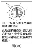 <單選題>古代人們在繪製地圖時,通常會將自己所處的區域放在地圖中央。圖Image(四)是某地區出土的古世界地圖及其說明,該地區當時所使用的文字,最可能為下列何者?