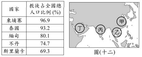 快查考古題 > 113會考社會試題_22 Posted in 會考113社會 會考社會113會考社會試題_22 🤖 🔊 朗讀內容 正在生成語音... <單選題>表(二)呈現五個國家2010年某宗教信徒占該國總人口數的比例(泰國、缅甸、不丹、斯里兰卡信徒比例高),根據內容判斷,此宗教的發源地最可能位於圖(十二)中甲、乙、丙、丁何處?(A)甲 (B)乙 (C)丙 (D)丁 答案 C 信徒比例高的國家多信仰佛教,佛教發源於印度,甲是中國,乙是中南半島,丙是印度,丁是阿拉伯半島,選C 題目與答案 借題發想 加入最愛清單 加最愛 相關試題111會考社會試題_53 會考社會 111會考社會試題_15 會考社會 109會考社會試題_35 會考社會 108會考社會試題_63 會考社會 106會考社會試題_37 會考社會 106會考社會試題_56 會考社會