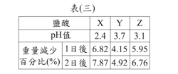 <單選題>牙齒酸蝕是指酸性物質會使牙齒外層的琺瑯質軟化,而容易損耗。小涵進行實驗一,探討不同pH值與牙齒酸蝕後重量減少的關係。他選用形狀大小很相近的豬牙齒,分別浸泡不同濃度的鹽酸數日,實驗一的結果如表(三)(pH值2.4時重量減少最多,3.7時最少)。小涵又進行實驗二,取形狀大小很相近的豬牙齒,分別浸泡在pH值介於2~4之間的甲、乙、丙三杯飲料中數日,發現牙齒重量减少百分比為丙<甲<乙。若實驗二只考虑pH值的影響,則依實驗一的結果,關於甲、乙、丙三杯飲料的推測,下列何者最合理?Image