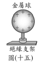 <單選題>將一顆裝在絕緣支架的不帶電金屬球,以感應起電的方式使金屬球帶正電,如圖(十五)。若接著再以手輕觸金屬球使其接地後,金屬球的帶電情形及其原因最可能為下列何者?Image
