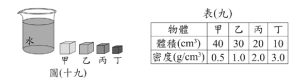 <單選題>將圖(十九)甲、乙、丙、丁四個不同材質的實心正立方體分別放入1L水中,水的密度為1.0g/cm³。已知四種物體皆不與水發生化學反應,且不吸水也不溶於水,則根據表(九)Image判斷,靜止平衡後,哪一個物體在液面下的體積最大?