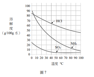 <選擇題>圖7是三種氣體於不同溫度下在水中的溶解度。此外,小華上網查了CO\(_2\)於0℃、20℃、40℃與60℃在水中的溶解度,分別是0.334、0.169、0.097、0.058(單位:g/100g水)。下列相關的敘述,何者正確?
