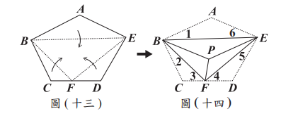 圖(十三)為一張五邊形紙片 \( ABCDE \),\( F \) 點在 \( CD \) 上,且以 \( BE \)、\( BF \)、\( FE \) 為摺線將紙片向內摺至同一平面後,\( A \)、\( C \)、\( D \) 恰重疊在同一點 \( P \),如圖(十四)所示。若 \( BE > FE > BF \),則根據圖(十四)中標示的角,判斷下列敘述何者正確?