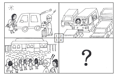 提示:請仔細觀察以下三幅連環圖片內容,並想像第四幅圖片可能的發展,然後寫出一篇涵蓋每張圖片內容且結局完整的故事。